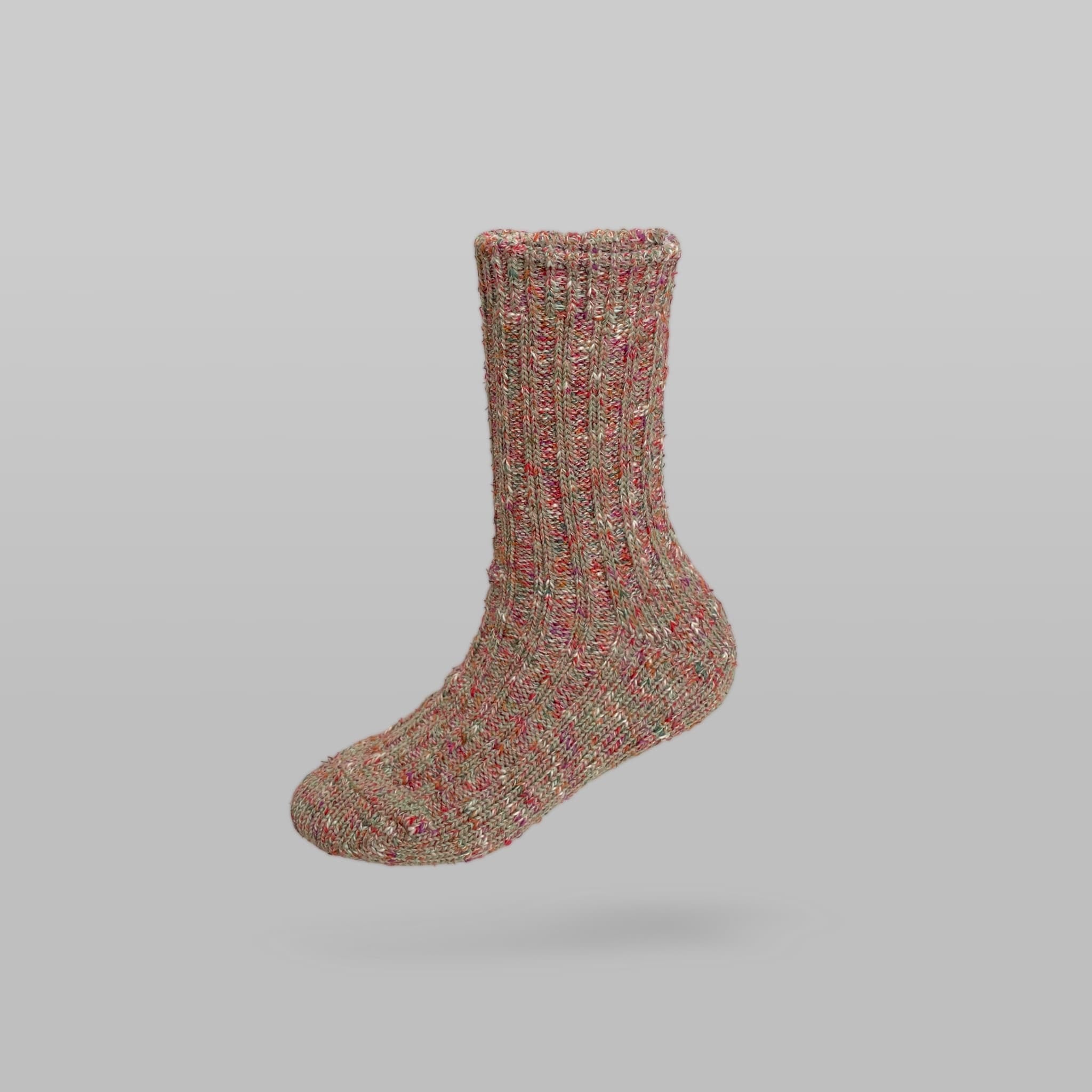 多色の糸を甘く撚り、奥行きのある「メランジ」に仕上げたミドル丈。 一般的な靴下は洗うたびに劣化しますが、この靴下は逆です。洗濯を重ねることで甘撚りの糸が馴染み、型崩れどころか、よりふっくらと豊かな風合いへ進化します。 「履き込むほどに完成する」という新しい価値観を、ぜひご体感ください。ギフトや自分へのご褒美にもふさわしい特別な一足です。