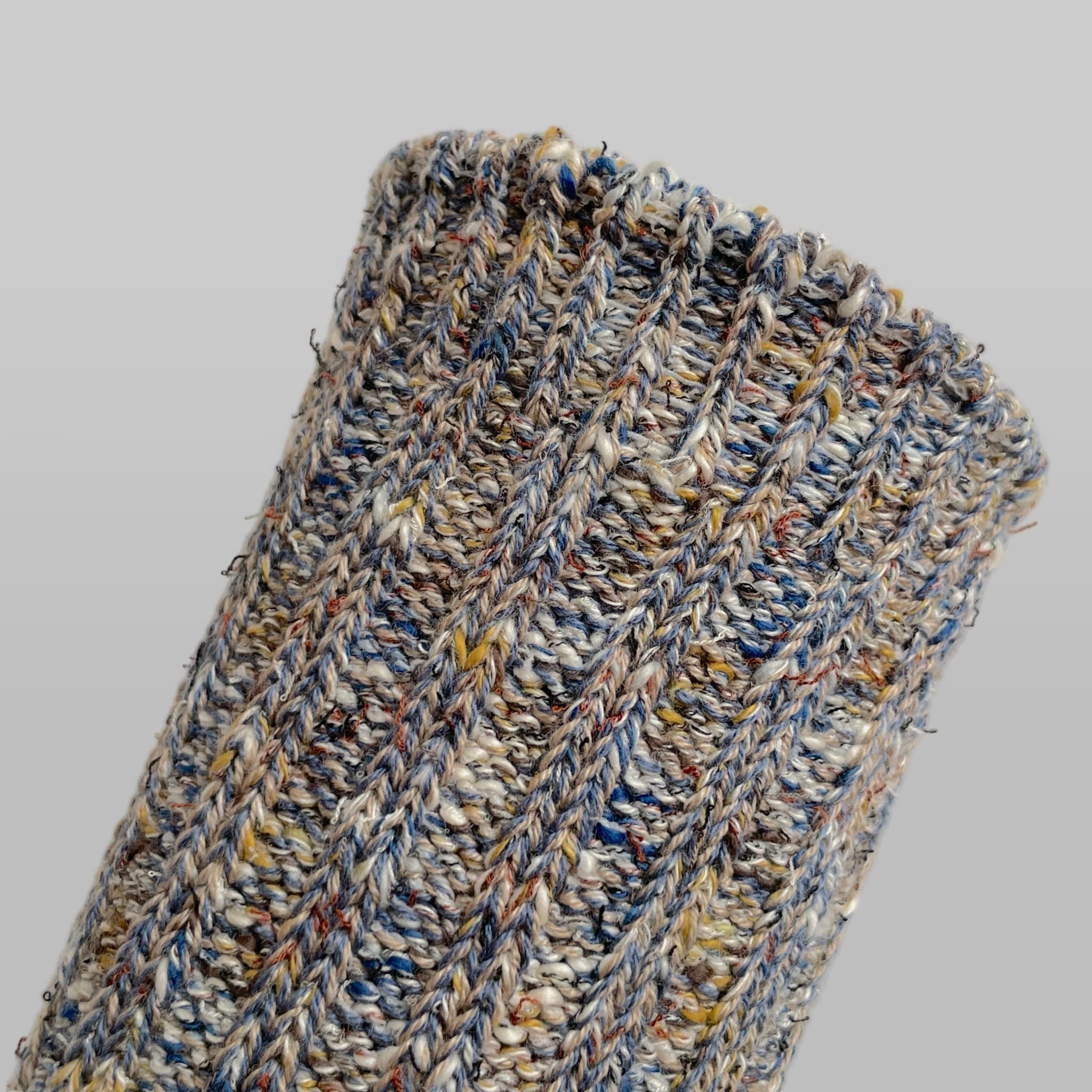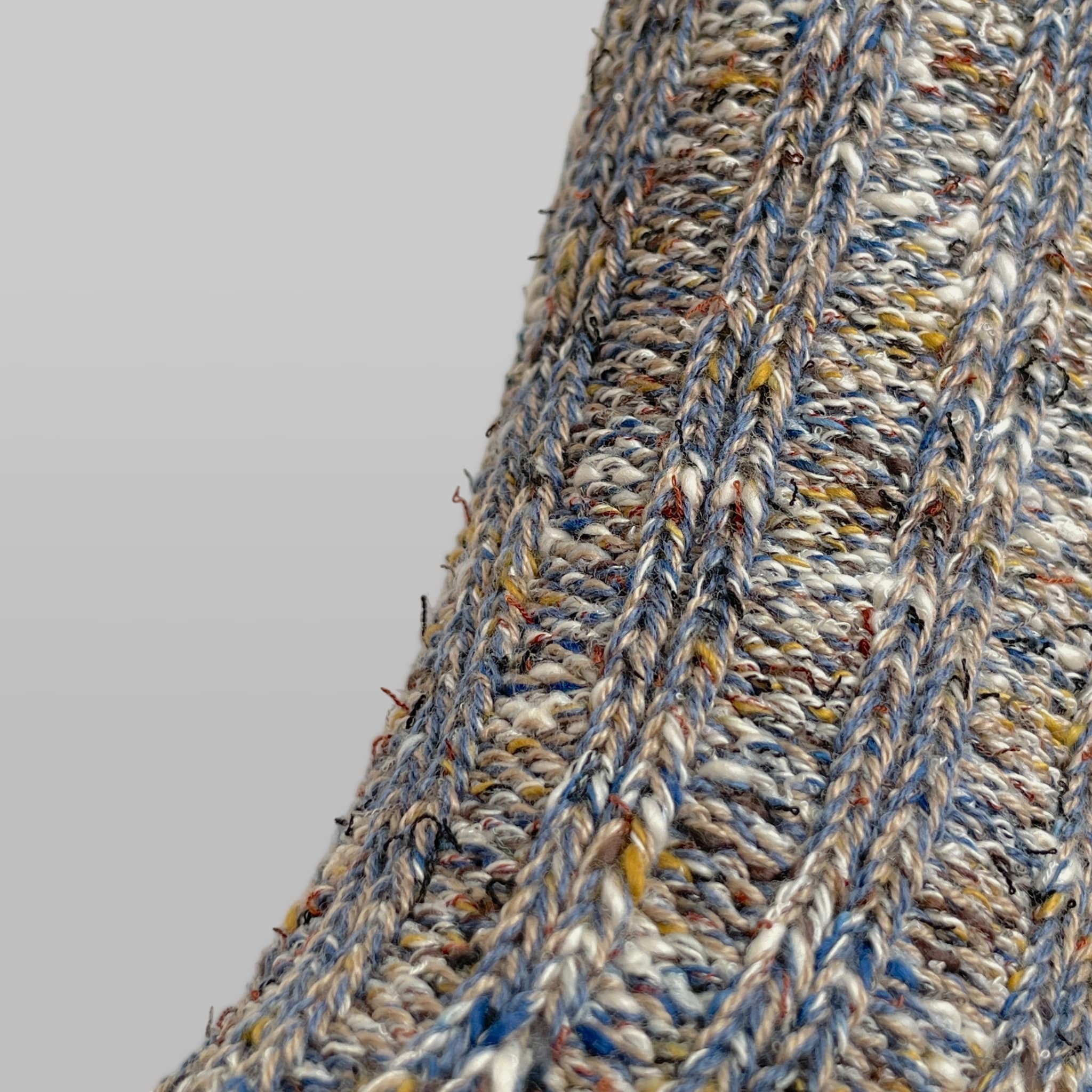 多色の糸を甘く撚り、奥行きのある「メランジ」に仕上げたミドル丈。 一般的な靴下は洗うたびに劣化しますが、この靴下は逆です。洗濯を重ねることで甘撚りの糸が馴染み、型崩れどころか、よりふっくらと豊かな風合いへ進化します。 「履き込むほどに完成する」という新しい価値観を、ぜひご体感ください。ギフトや自分へのご褒美にもふさわしい特別な一足です。