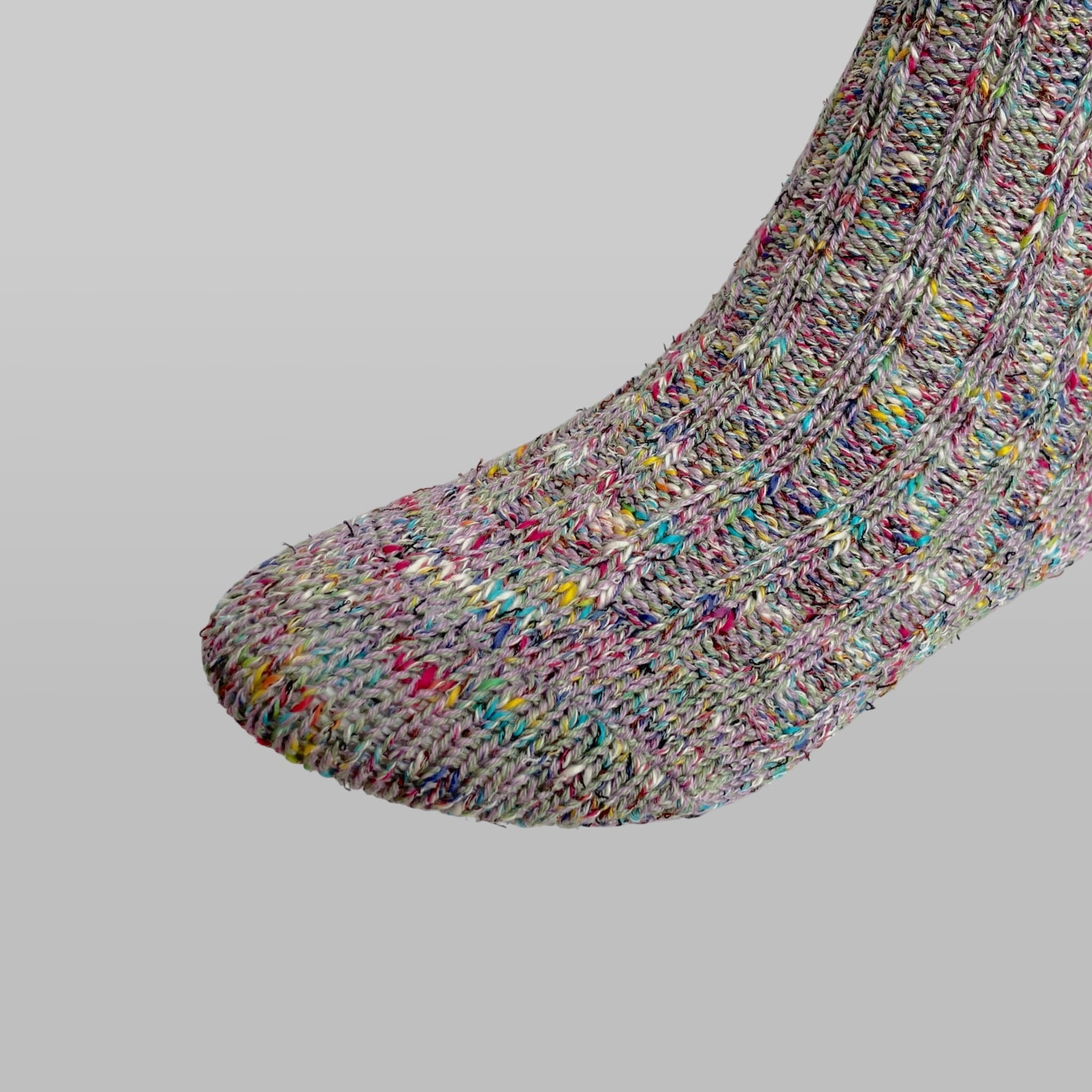 多色の糸を甘く撚り、奥行きのある「メランジ」に仕上げたミドル丈。 一般的な靴下は洗うたびに劣化しますが、この靴下は逆です。洗濯を重ねることで甘撚りの糸が馴染み、型崩れどころか、よりふっくらと豊かな風合いへ進化します。 「履き込むほどに完成する」という新しい価値観を、ぜひご体感ください。ギフトや自分へのご褒美にもふさわしい特別な一足です。
